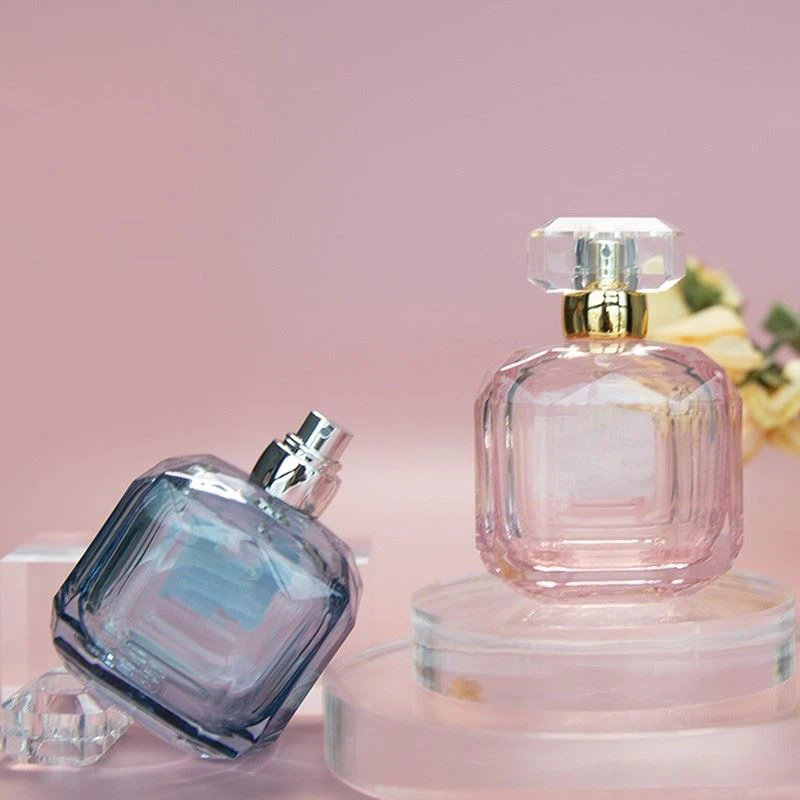 この四角いガラス製香水瓶の具体的なサイズは、L67.2×W57.2×H95.72mm、重量256g、正味含有量100mlです。 ピンクとブルーの色がありますが、カスタムカラーも歓迎します。 ボトルの全体的なデザインは小さくて絶妙で、色は非常にエレガントで新鮮な香水に適していますが、このボトルは手に非常に重く、安くは見えません。